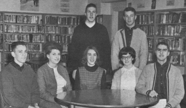 This year's library club members are: (from L. to R.) FIRST ROW: Cecile Beaubien, Marilyn McKeown, Heather Zais, Janice Williams, Calista Harvey. SECOND ROW: Bill Mugford,(Pres.), Evelyn Frolek (Sec.) Alice Kennedy (Vice-Pres.), Sharon Munter, Margaret Ladbury, John Kingsbury. MISSING: Bev. Elliott.