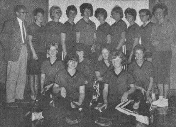 Left to right: FIRST ROW: Pat Murdock, Jo-anne Kipp, (Co-Captain) Valerie Moffat, Laurie Bell, Gail Stephens. SECOND ROW: Miss Minette (Sponsor & Coach), Sharon Tucker, Janice Zingrich, Mary Thompson, Karen Bond, Bonnie Stewart, (Co-Captain), Karen Hughey (Manager).